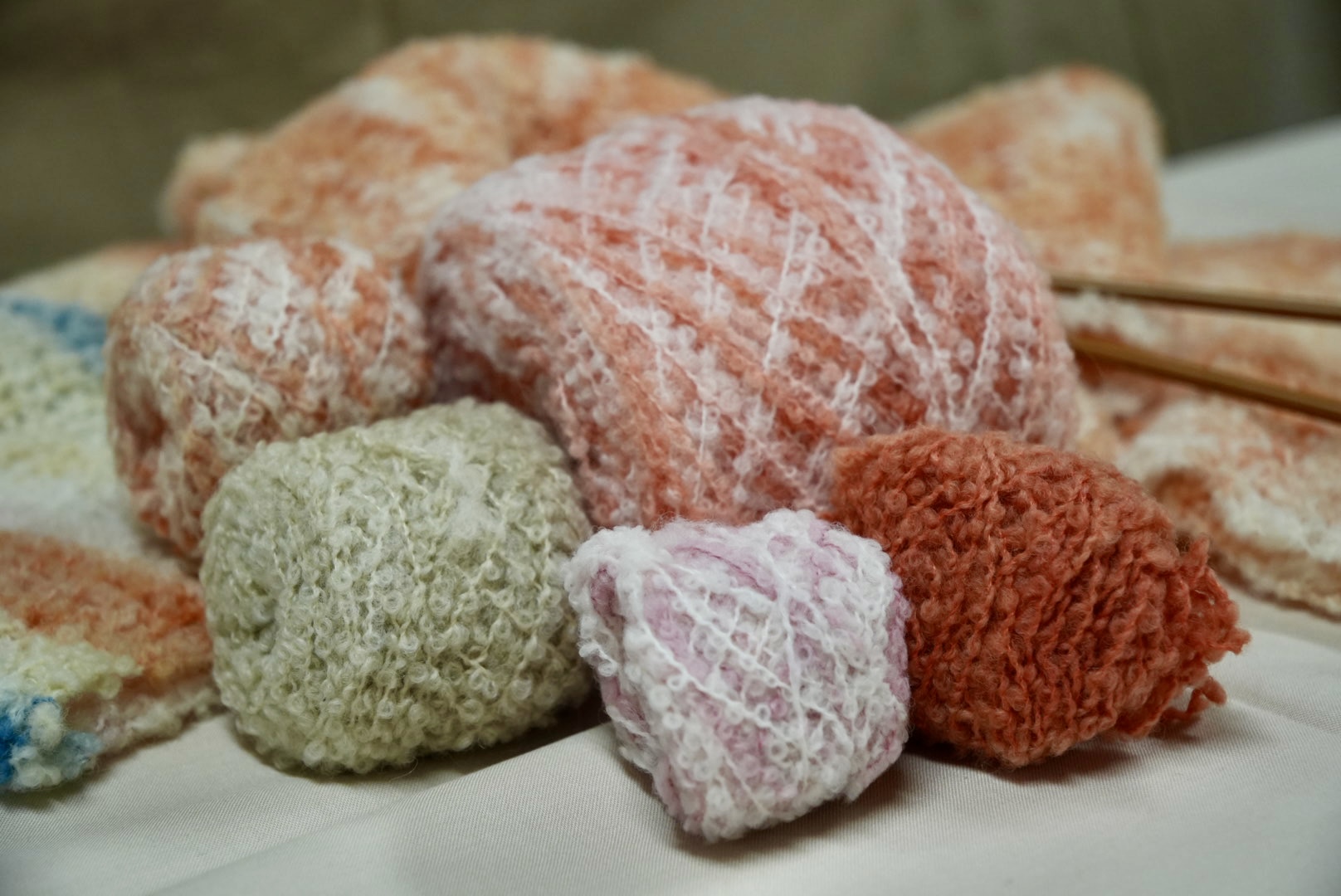 *写真中央の毛糸はウールを茜で染めたもの。この毛糸1玉で奥に置いてあるストールが編めます。