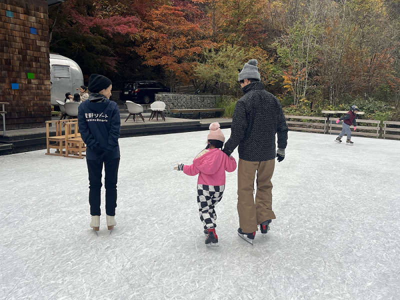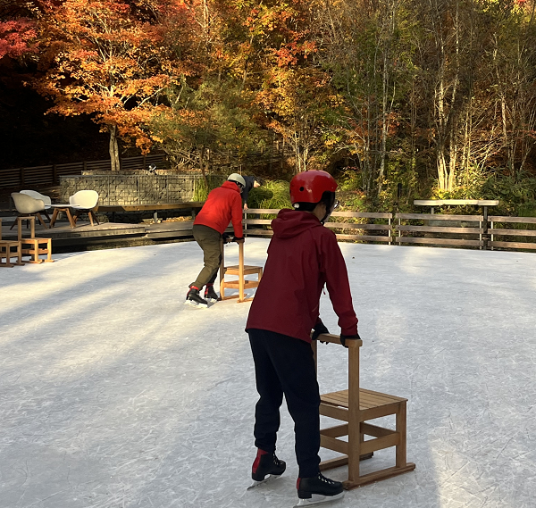 The colorful trees around the rink swayed, and the breeze caressed our cheeks, creating a pleasant experience. With breaks in between, everyone gradually got the hang of it, and by the end of the experience, some were able to skate without a chair. "I can skate better than at the beginning!", "It feels great to skate while looking at the autumn leaves," and "It was so much fun!" echoed throughout the venue.