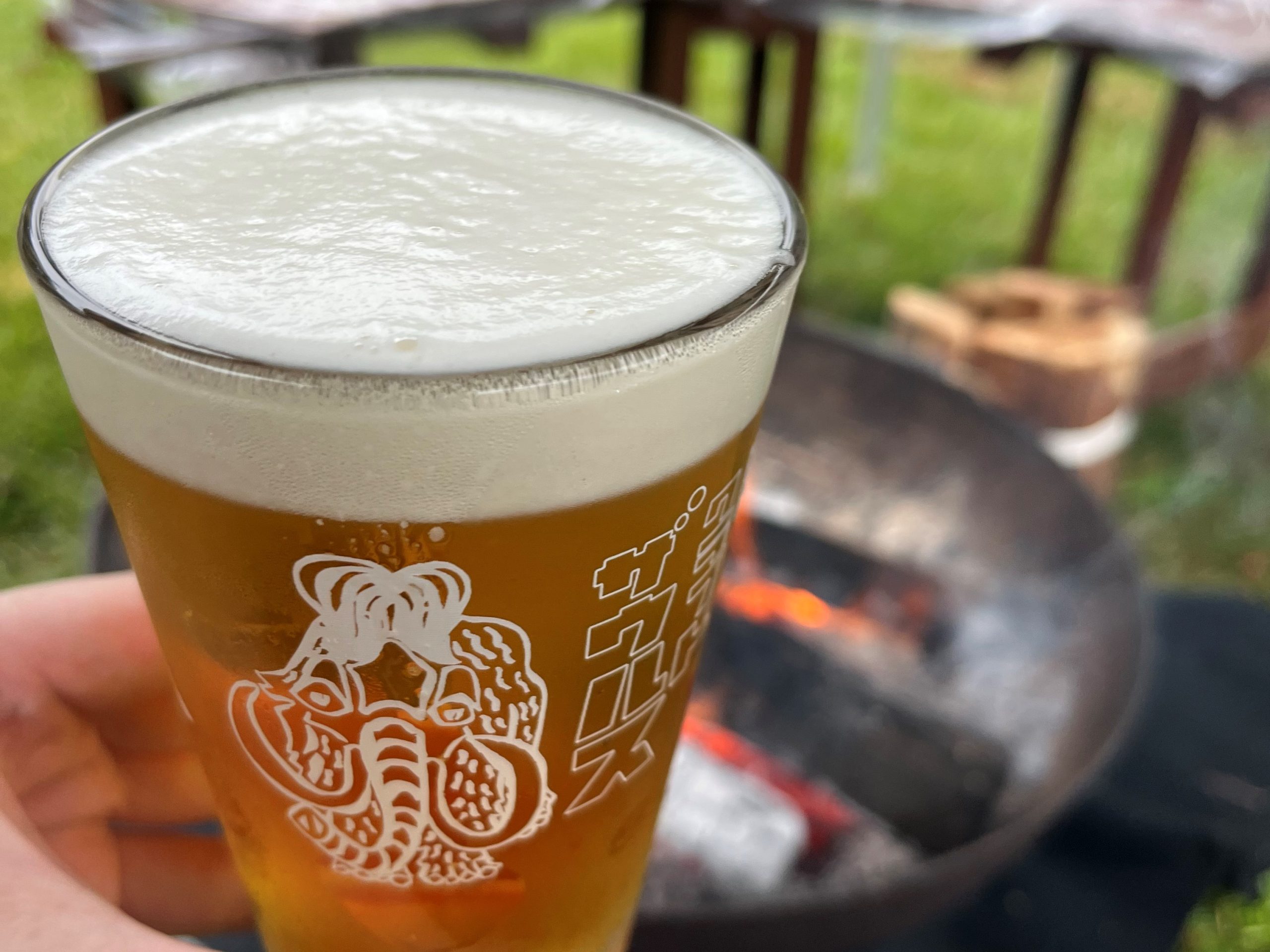セミナーの締めくくりには、「クラフトザウルス」と「フレッシュホップ」を飲み比べながら、村民食堂で販売している人気メニュー“山賊焼き”をおつまみに楽しみました。