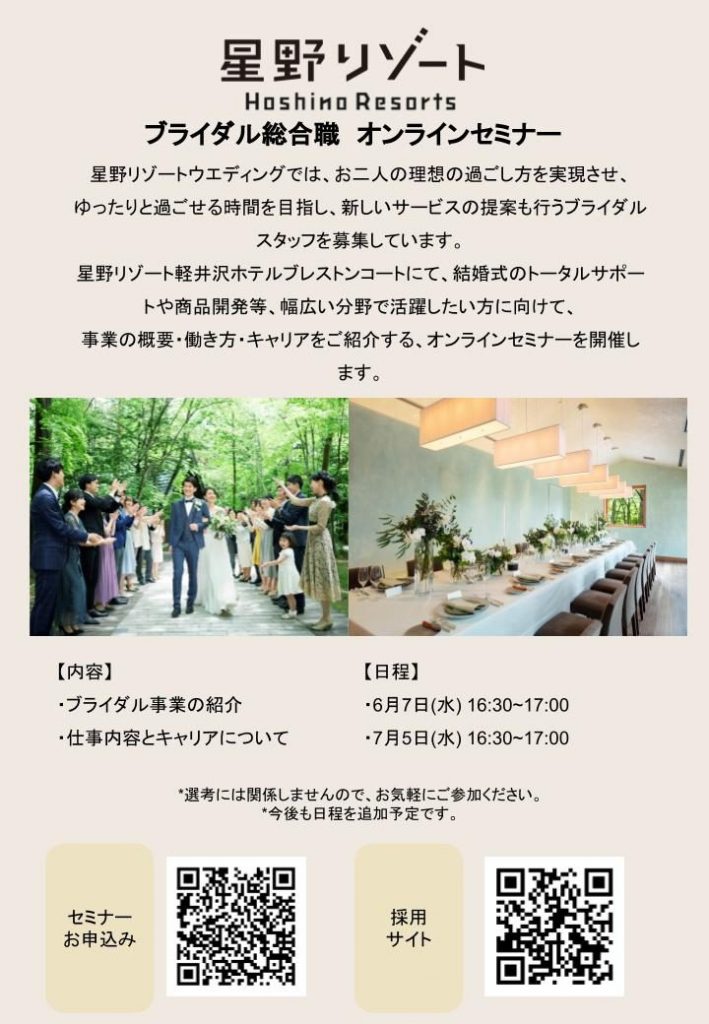 2023.05.09 24年新卒・キャリア採用 ブライダル総合職 オンラインセミナーのご案内 セミナーのお申込みはこちらから→ お申込みフォーム ※セミナーはGoogle Meetにて実施いたします。 Googleアカウントおよびスマートフォンの場合はアプリが必要となりますので、事前にご準備をお願いいたします。 24年新卒採用 ウェディング・フォトグラファーOnline見学会のご案内 一覧 【25年新卒採用】 夏の1Dayインターンシップのご案内