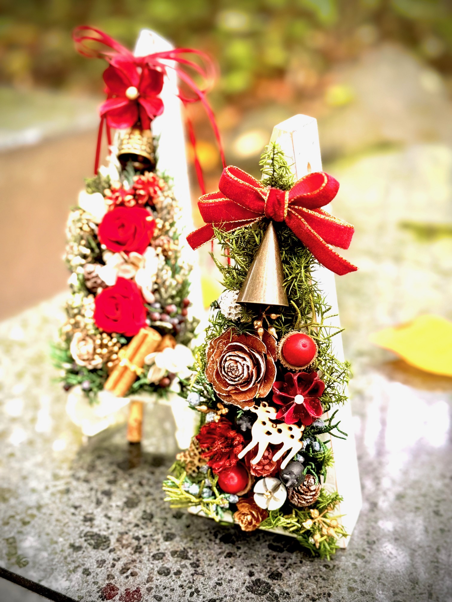 將堅果等天然材料裝入木箱,做成一棵聖誕樹。